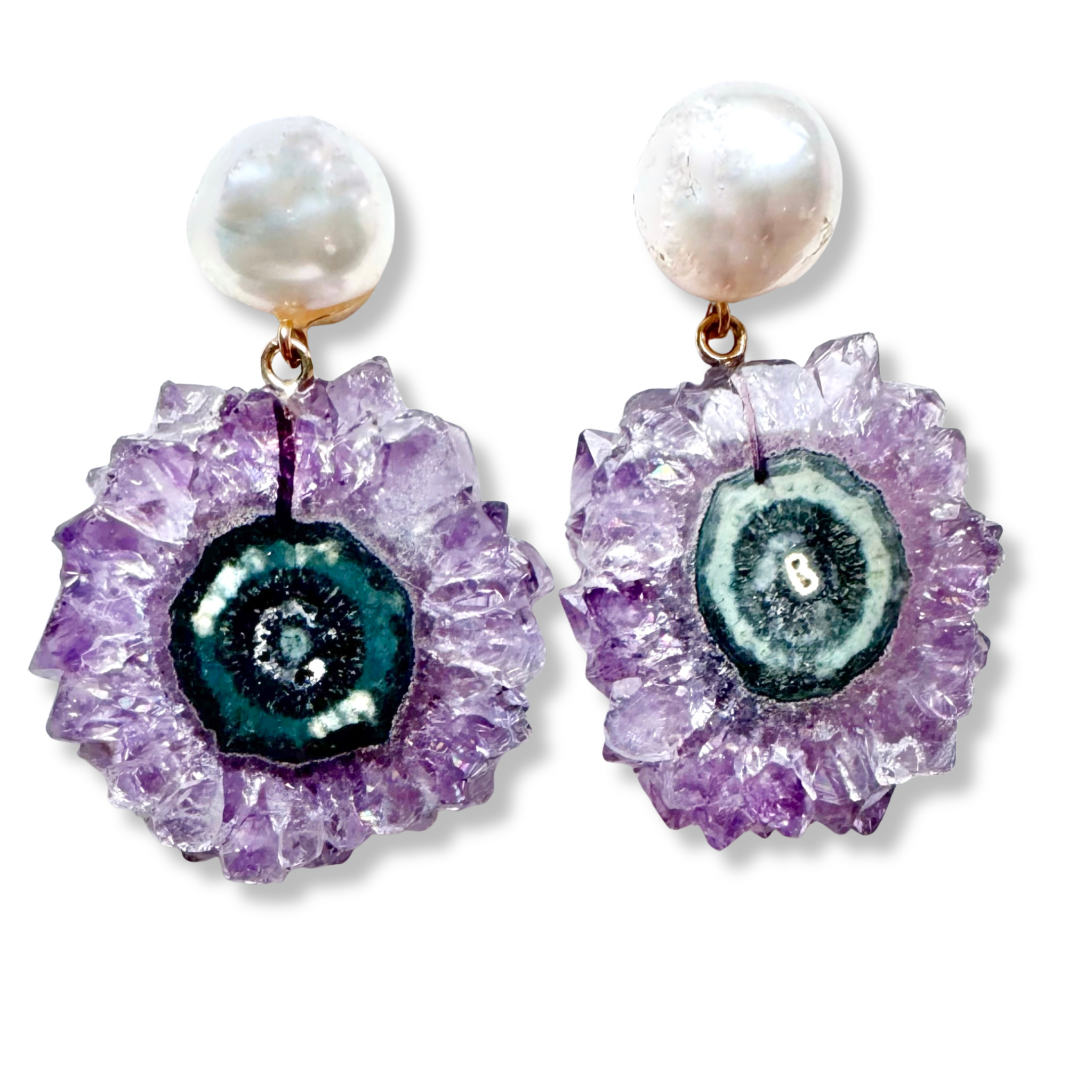 Slices of Amethyst minerals drop off of Baroque South Sea Pearls. The Amethysts are about 1" in diameter.